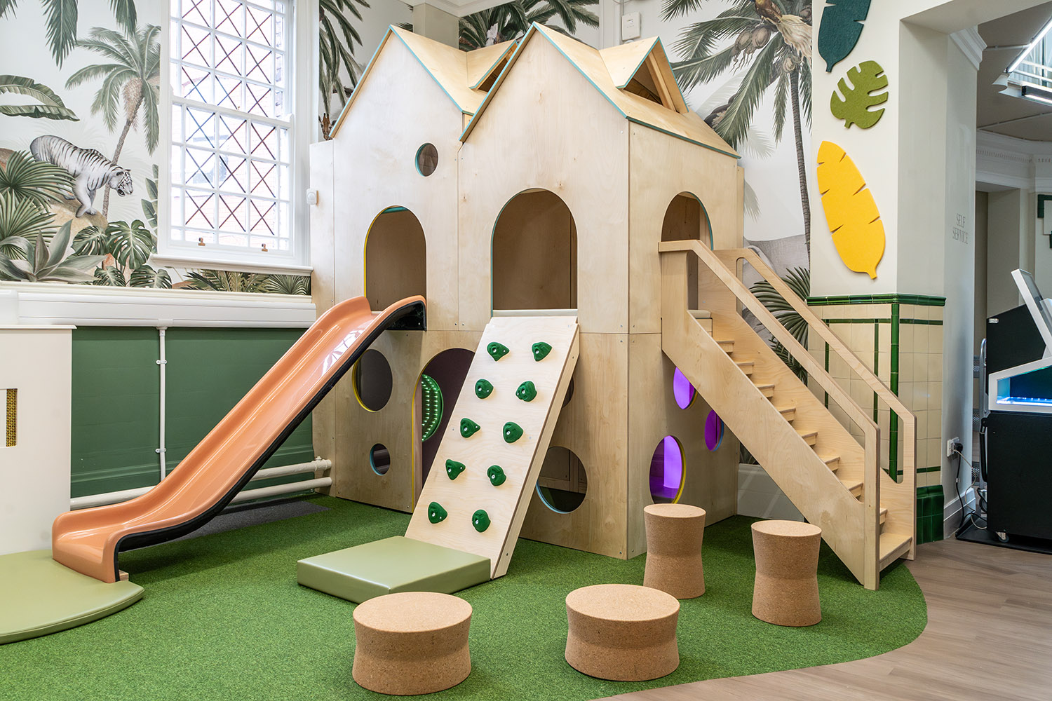 Kork är lätt att rengöra, ljudabsorberande och brandhärdigt, vilket gör den perfekt för allmänna utrymmen och särskilt barnens miljö.