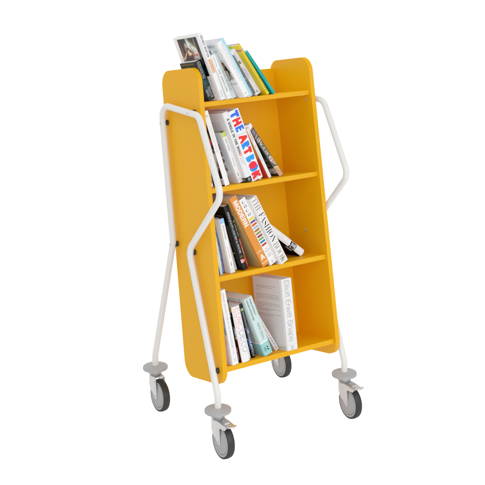 Ergonomisk, användarvänlig, enkelsidig bokvagn med 4 hyllplan med generösa hyllavstånd. Idealisk även för böcker i det lite större formatet.