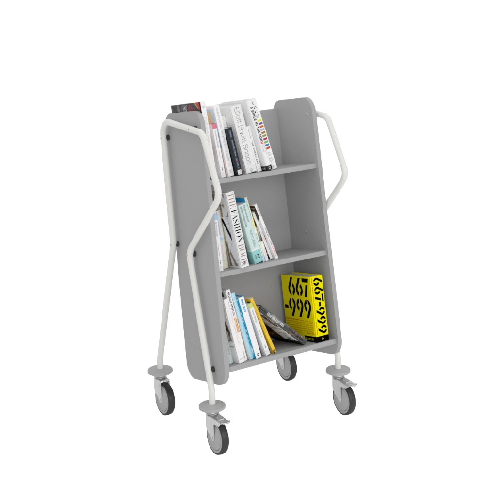 Ergonomisk, användarvänlig, enkelsidig bokvagn med 3 hyllplan med generösa hyllavstånd. Idealisk även för böcker i lite större format.