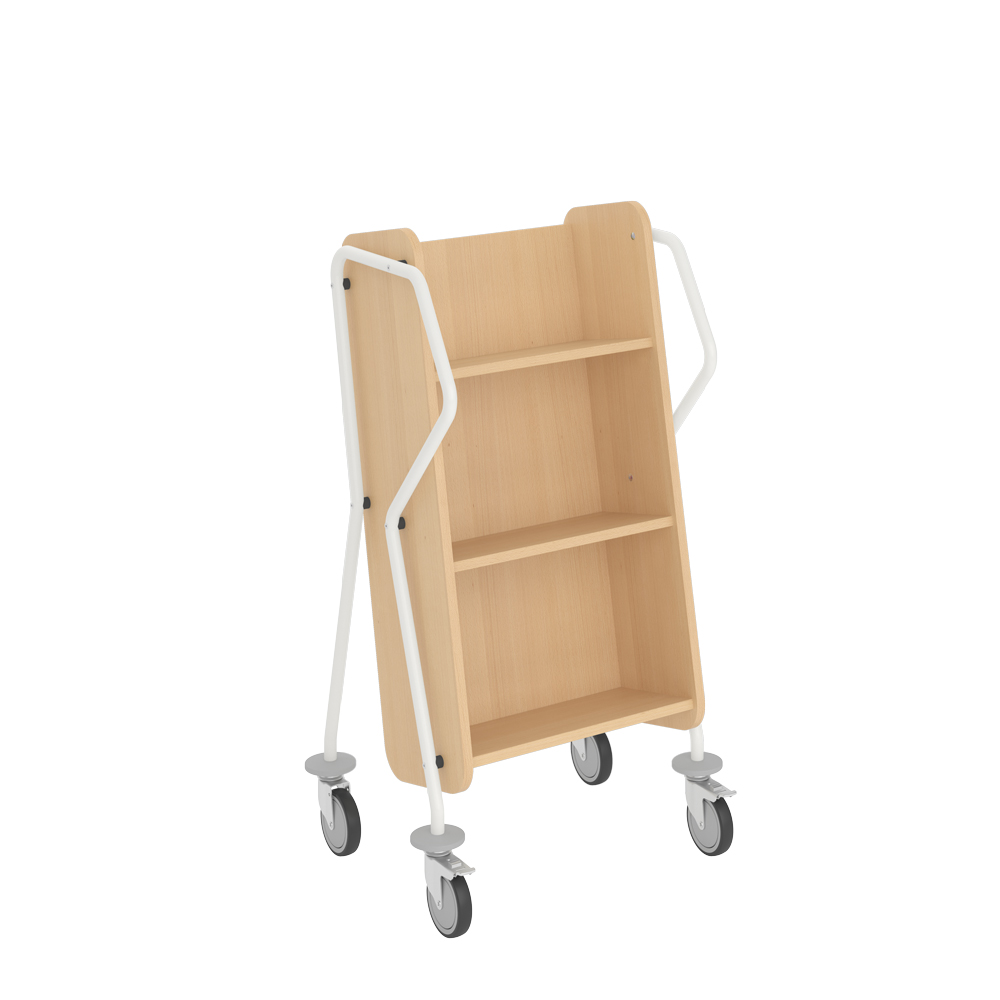 Ergonomisk, användarvänlig, enkelsidig bokvagn med 3 hyllplan med generösa hyllavstånd. Idealisk även för böcker i lite större format.
