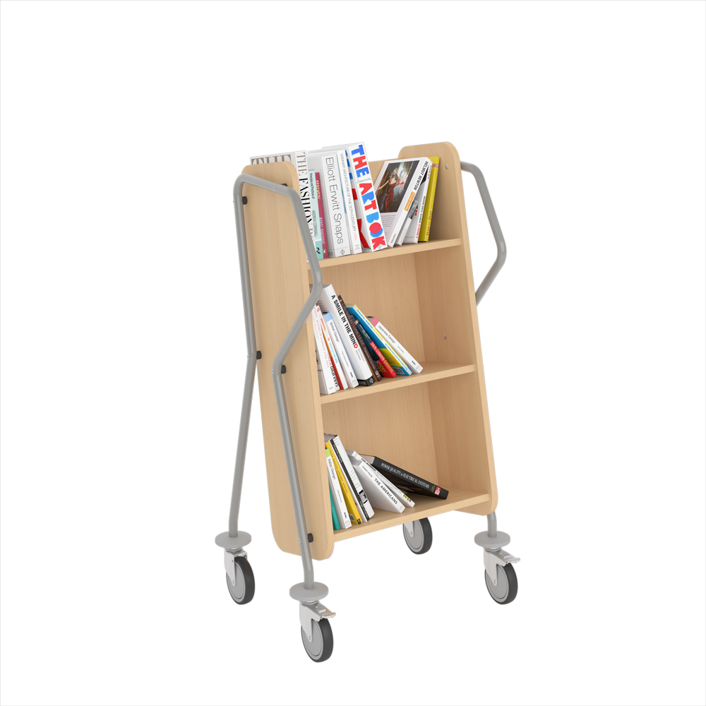 Ergonomisk, användarvänlig, enkelsidig bokvagn med 3 hyllplan med generösa hyllavstånd. Idealisk även för böcker i lite större format.