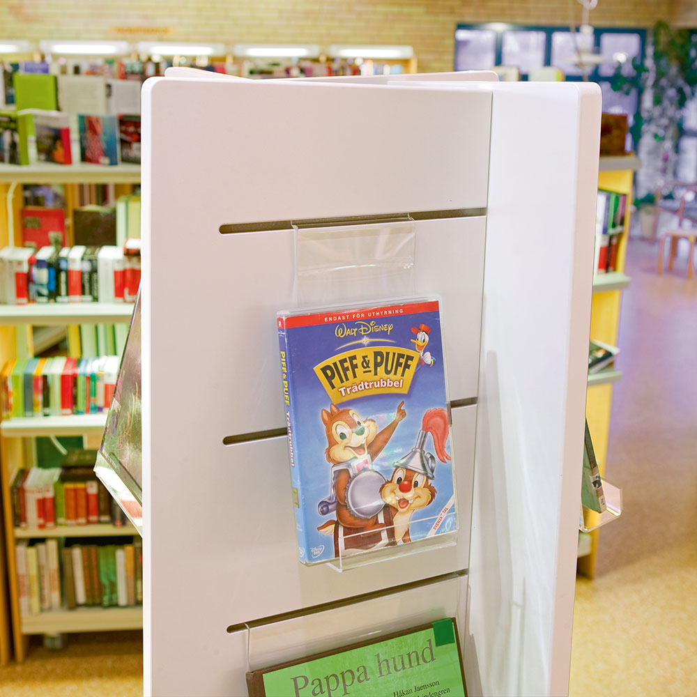Allsidiga hållare för flexibel frontexponering av böcker, AV-media som CD/DVD, tidskrifter, broschyrer.