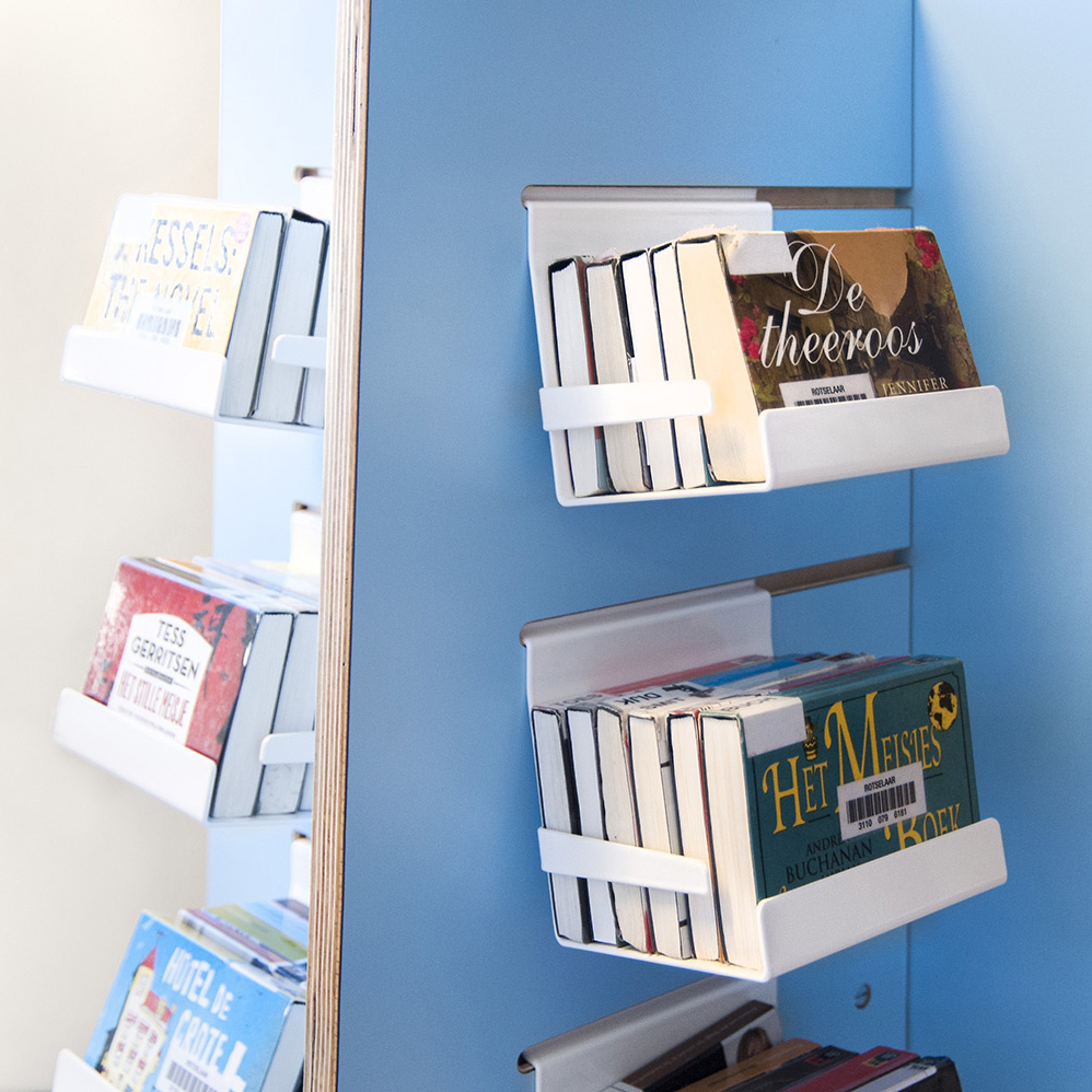 Allsidiga hållare för flexibel frontexponering av böcker, AV-media som CD/DVD, tidskrifter, broschyrer.