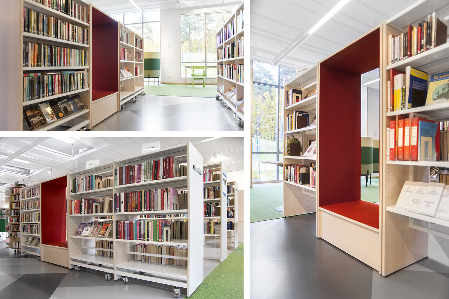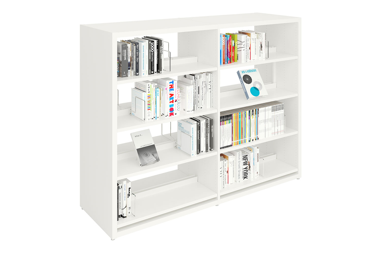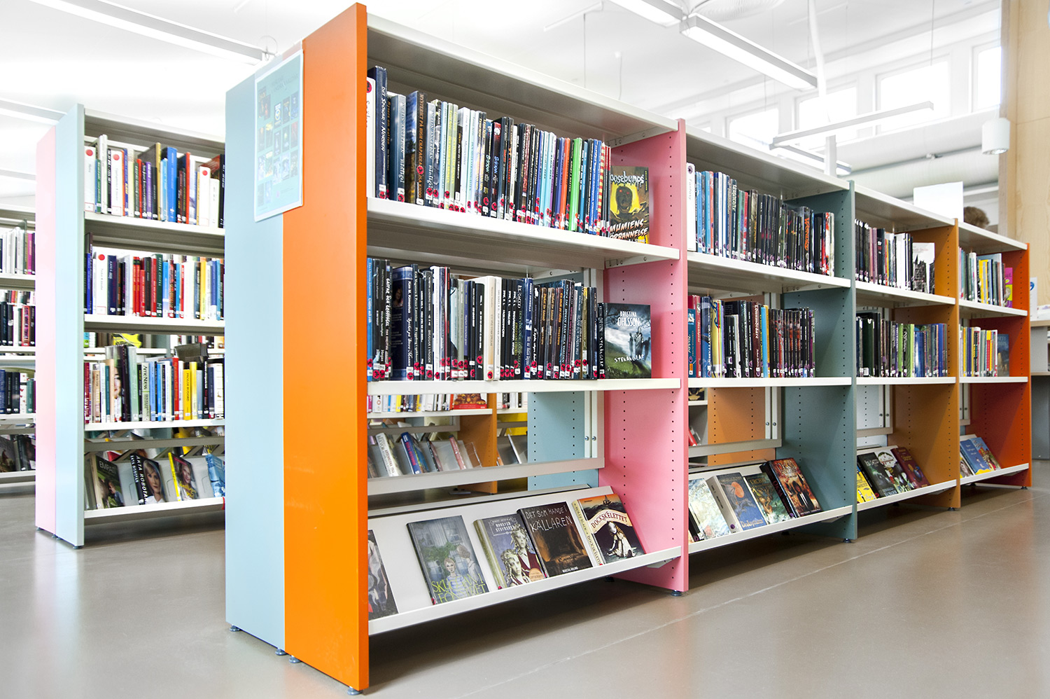 Hyllsektionerna monteras antingen med en öppen stålram eller med hel rygg av trä. Denna lösning, som vi lanserade för över trettio år sedan, gör det enkelt att lägga till eller ta bort enskilda sektioner utan att demontera hela hyllrader.