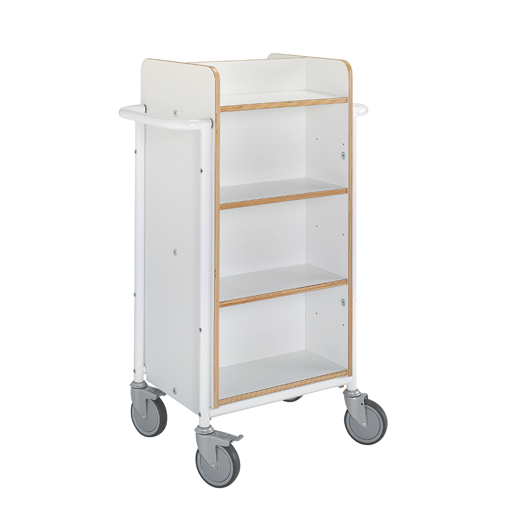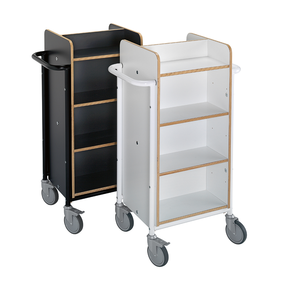 Funktionell, dubbelsidig vagn med 8 hyllplan. 6 hyllplan är flyttbara för att passa olika bokstorlekar.