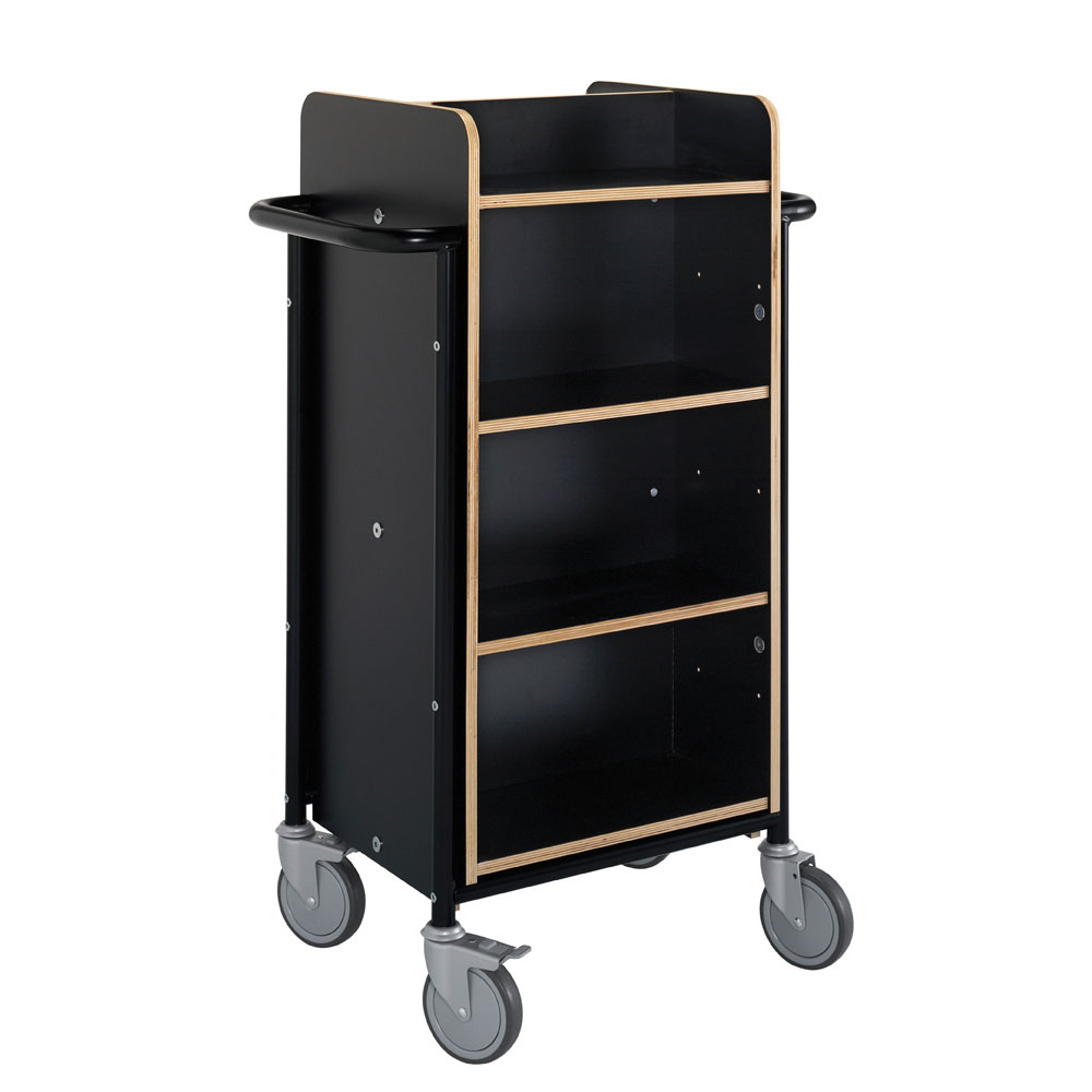 Funktionell, dubbelsidig vagn med 8 hyllplan. 6 hyllplan är flyttbara för att passa olika bokstorlekar.