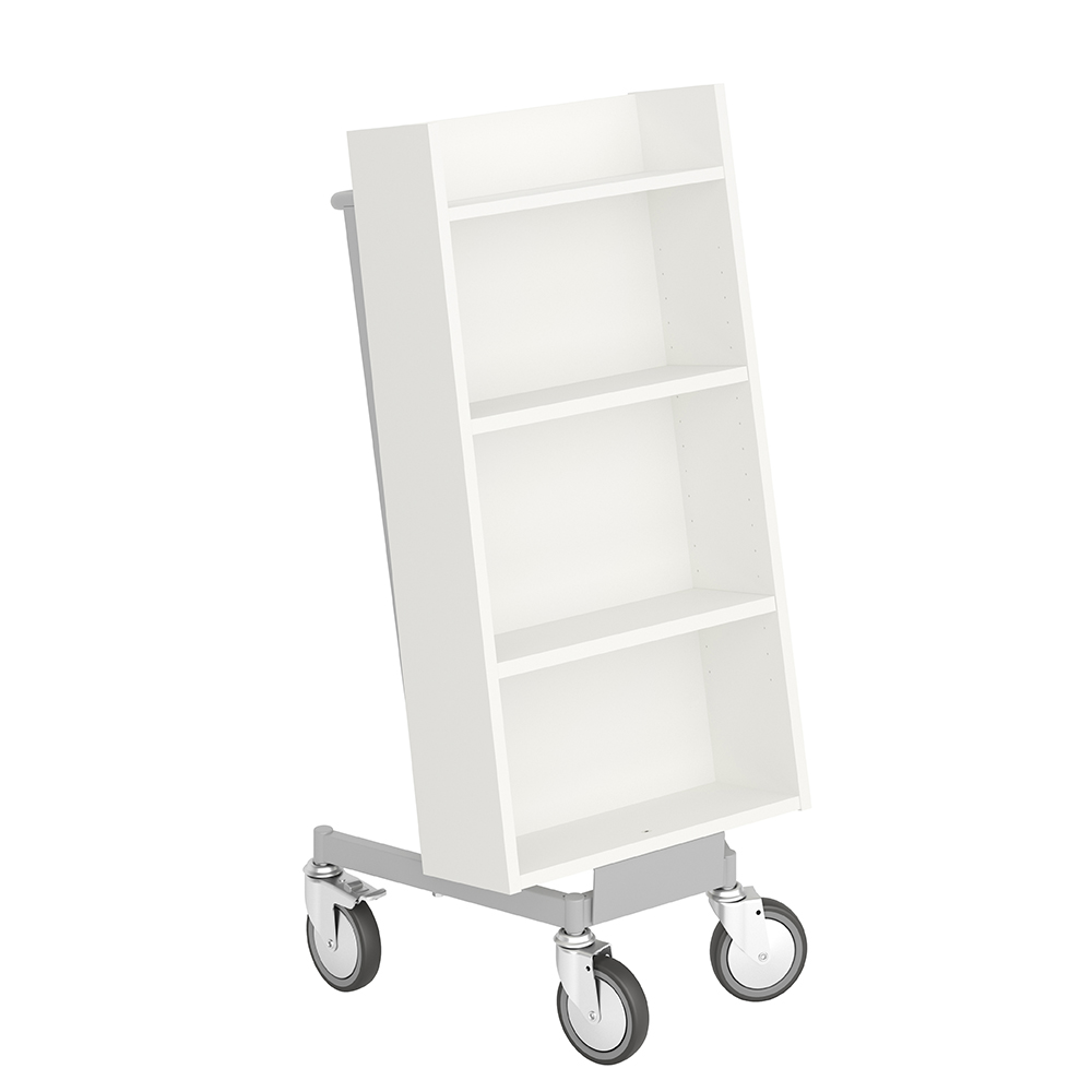 Smidig, enkelsidig vagn med 4 hyllplan. De två mellersta hyllplanen är flyttbara för att passa olika bokstorlekar.