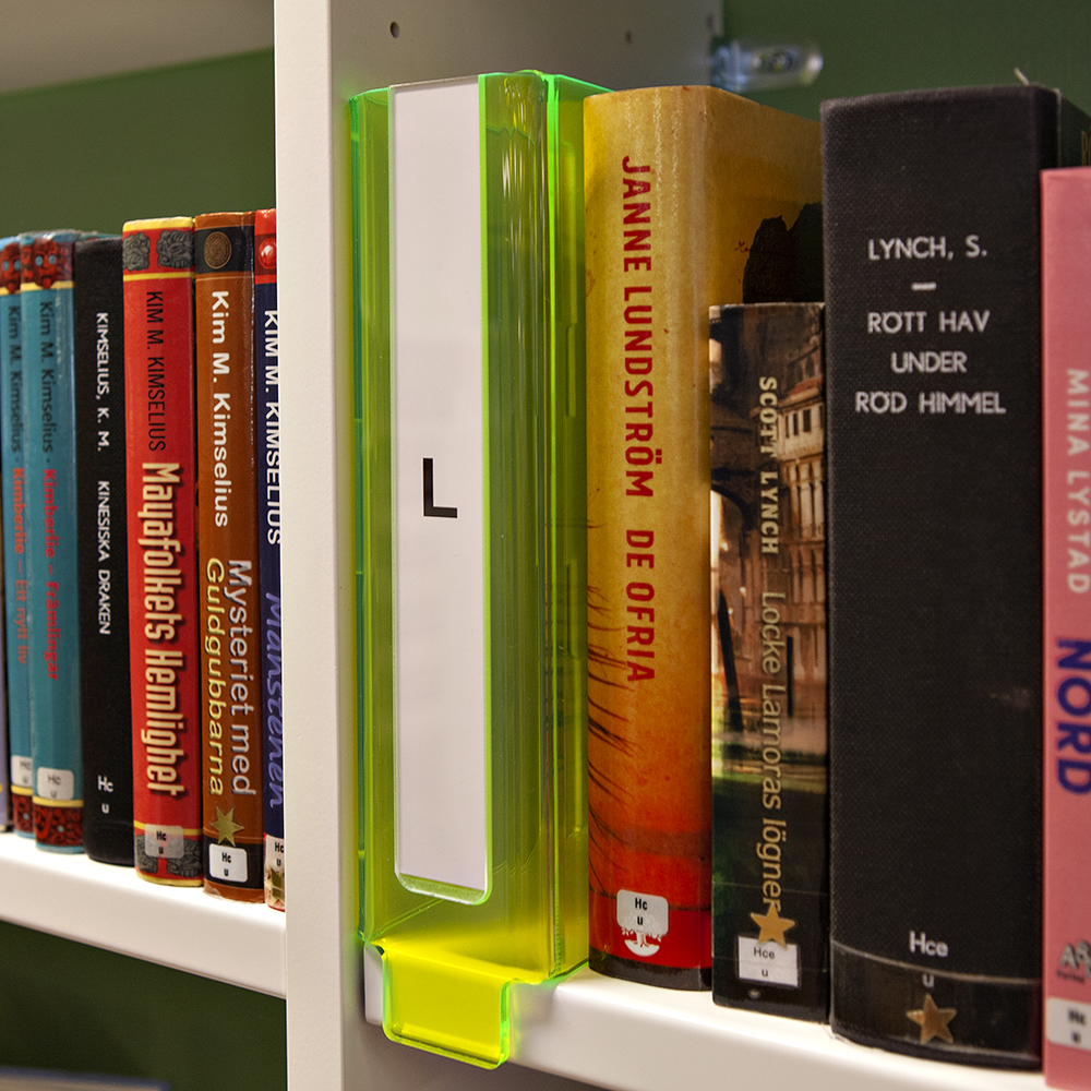 Hyllmarkeringar i glass look eller med fluorescerande effekt. Hög detaljfinish.