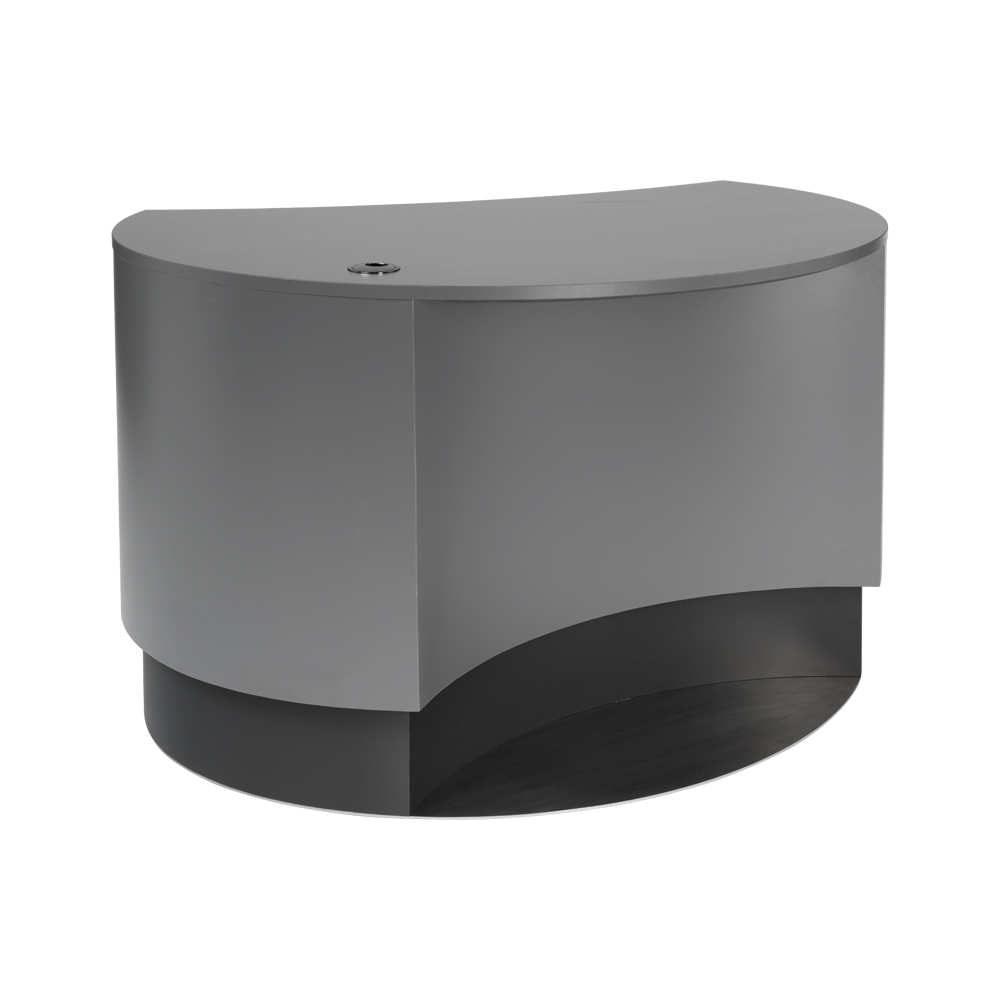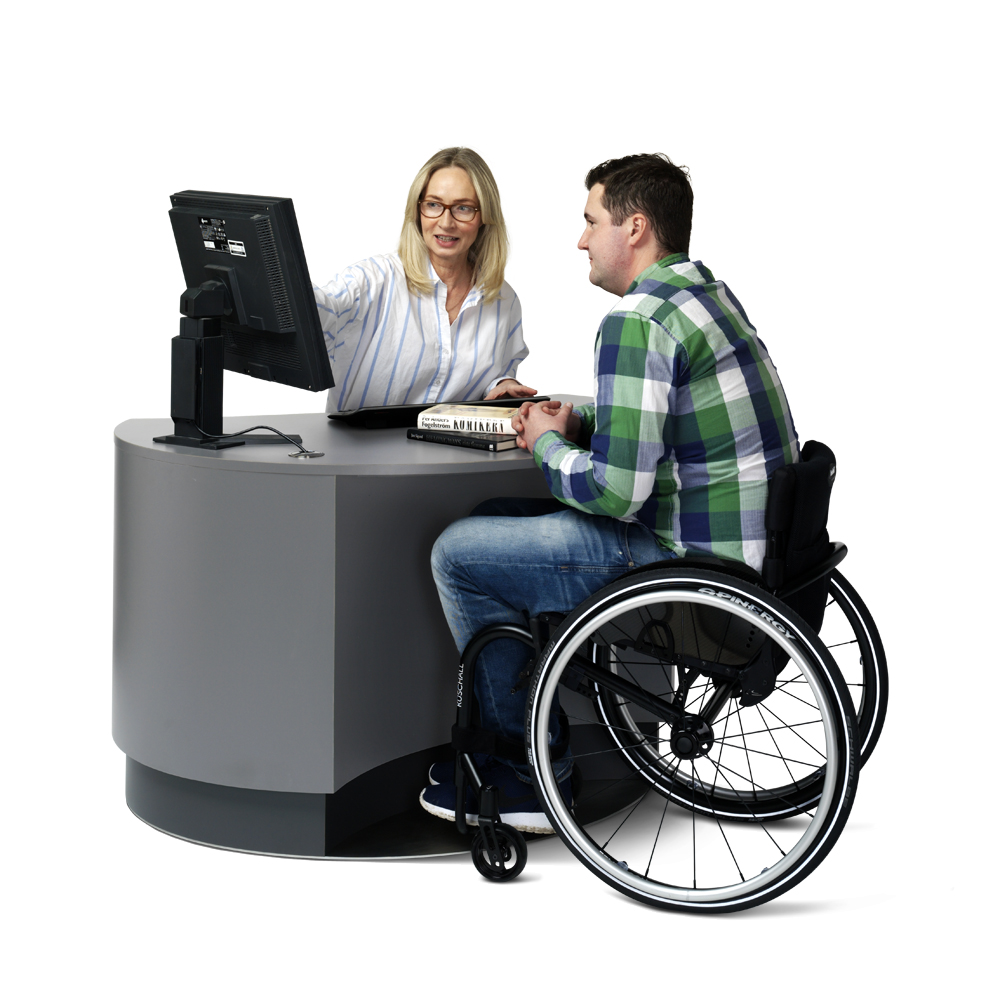 Elektriskt höj- och sänkbar för god ergonomi. Den indragna fronten gör att besökare kan komma närmare även med rullstol eller rullator.
