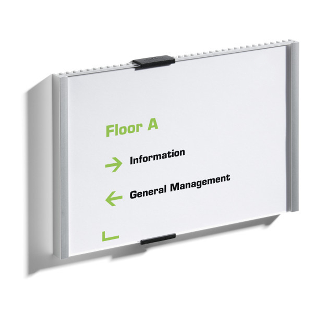 Stilren skylthållare för instick med reflexfri frontskiva i akryl.
