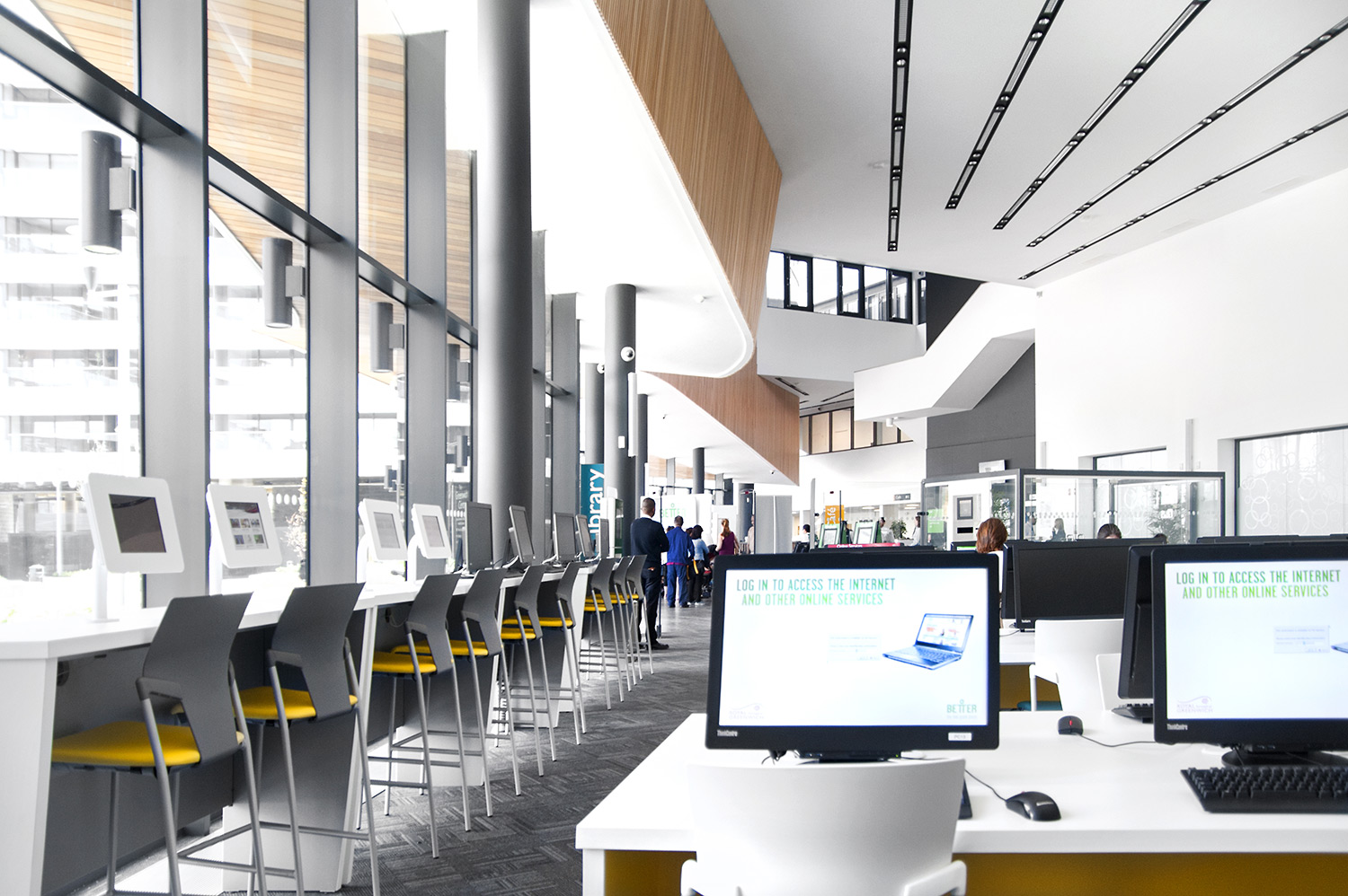 I hela biblioteket gör digitala yttergavlar det möjligt att söka efter specifika böcker och författare. Samtidigt kan de komma åt bibliotekets app, som lyfter fram de senaste böckerna och faciliteter som är tillgängliga för alla.