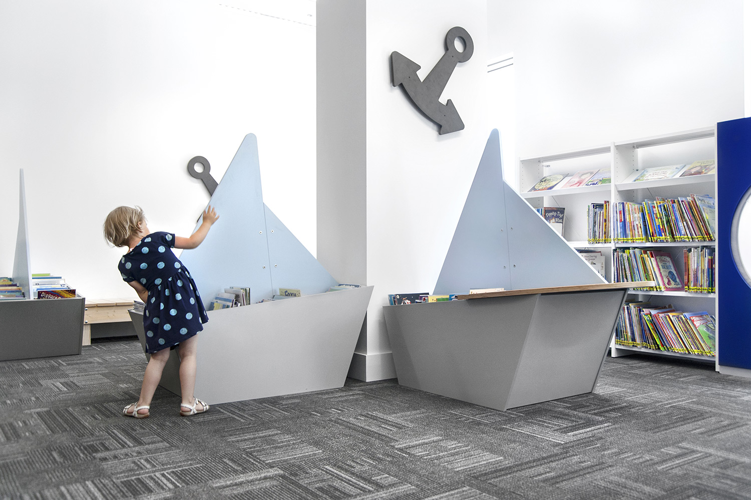 För att införliva Greenwichs betydelsefulla historia har ett maritimt tema introducerats i biblioteket. Barnbiblioteket är alltså utrustat med båtformade bilderbokslådor och på hyllorna finns vågor, ankare och hyttventiler som barnen kan roa sig med.
