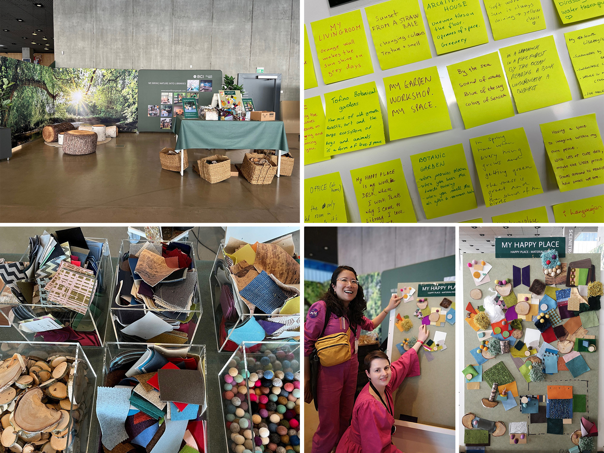Dessutom bad vi våra gäster att välja material för att beskriva sin GLADA PLATS på en moodboard. Flera av de utvalda materialen och mönstren hade rötter i naturen och färgerna dominerades av grönt, blått och brunt. Urvalet av material som symboliserar allas GLADA PLATS ledde till spännande dialoger om utformningen av bibliotek och materialval för möbler. Dessutom framhöll dessa val naturligtvis en hållbarhetsaspekt.