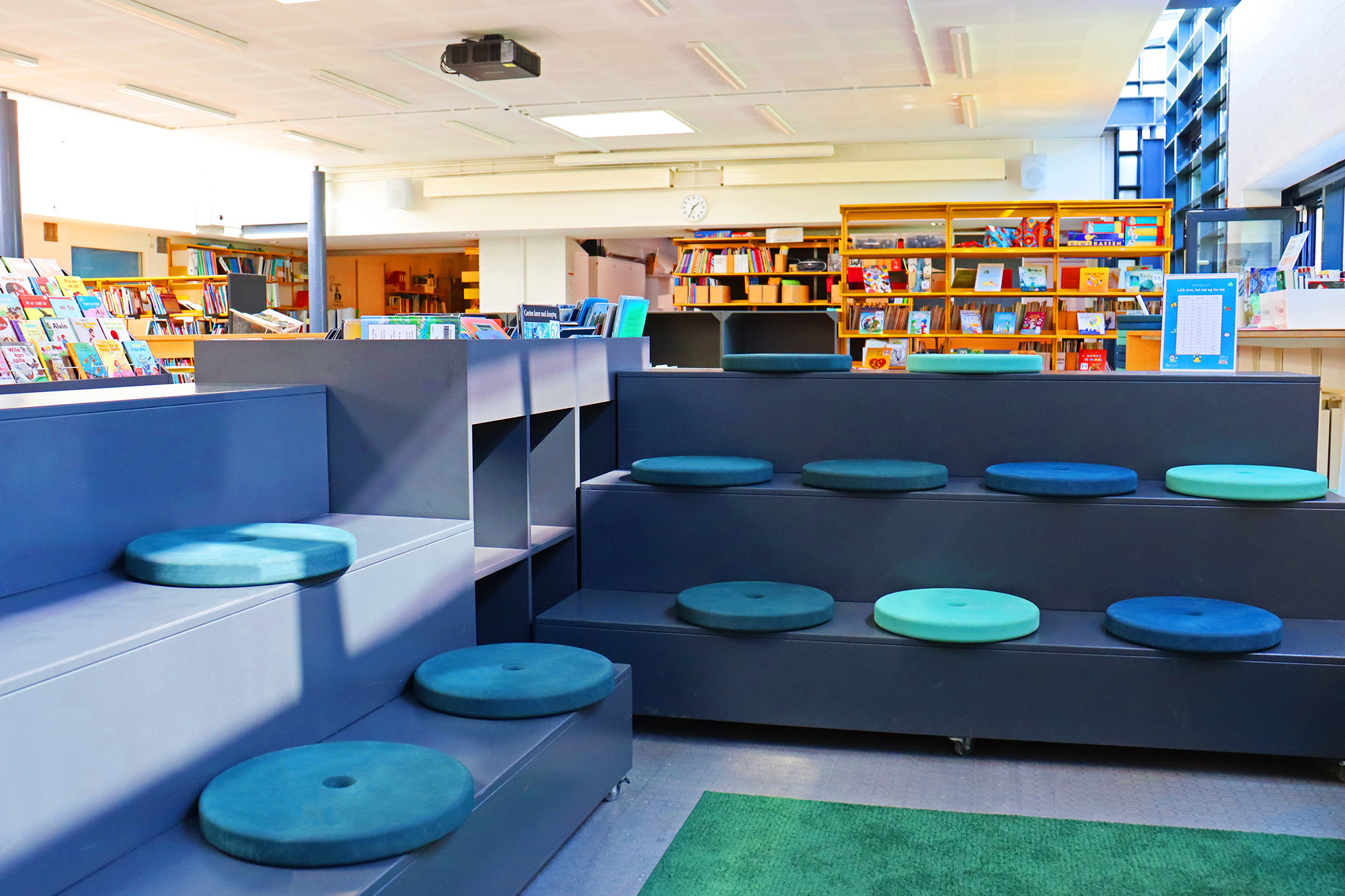 Eva passar in i alla rum på biblioteket och är idealisk för att skapa liv och glada dagar på golv och bänkar samt vid trappområden.
