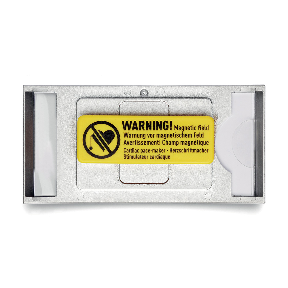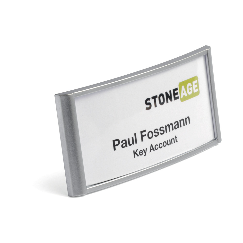 Praktisk namnbricka med magnetiskt fäste.
