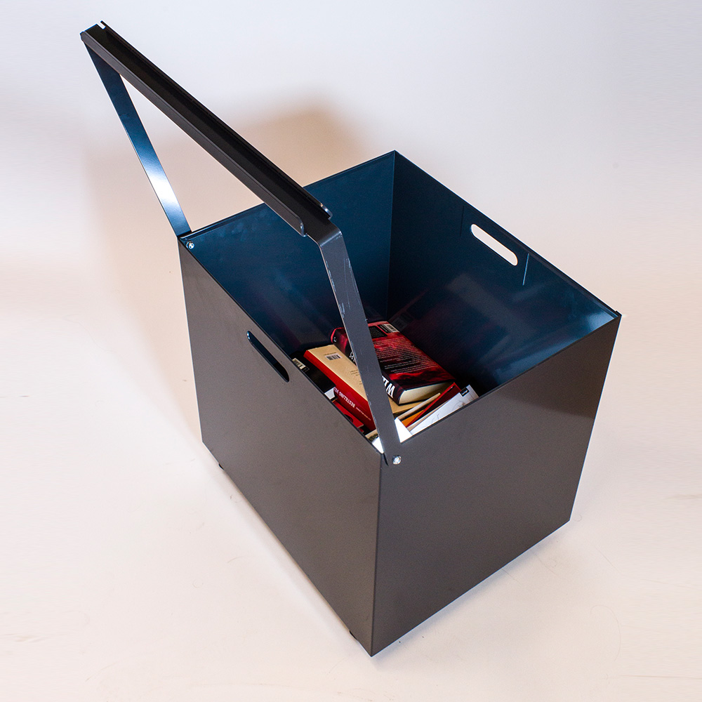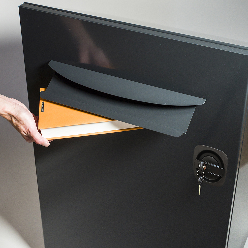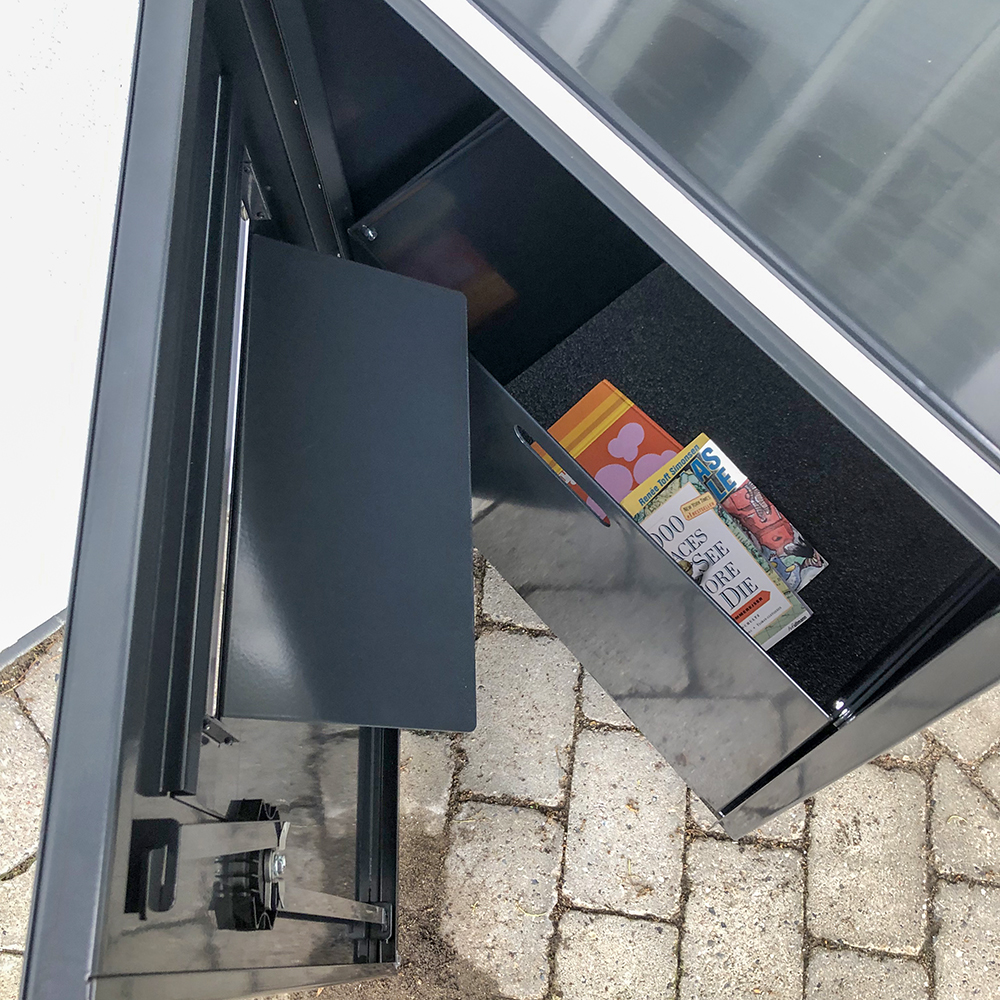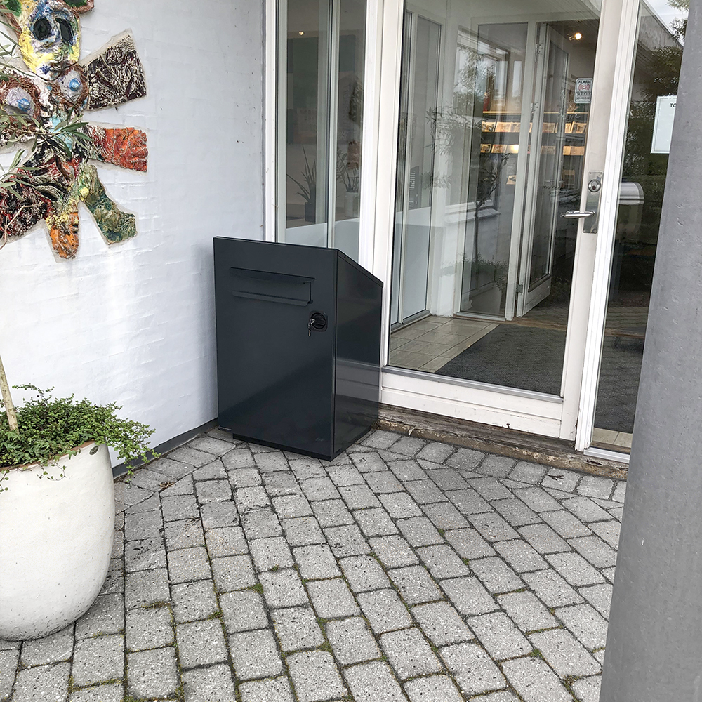 Robust, låsbart återlämningsfack i metall för utomhusbruk. Lämpligt för bibliotek med begränsade öppettider.