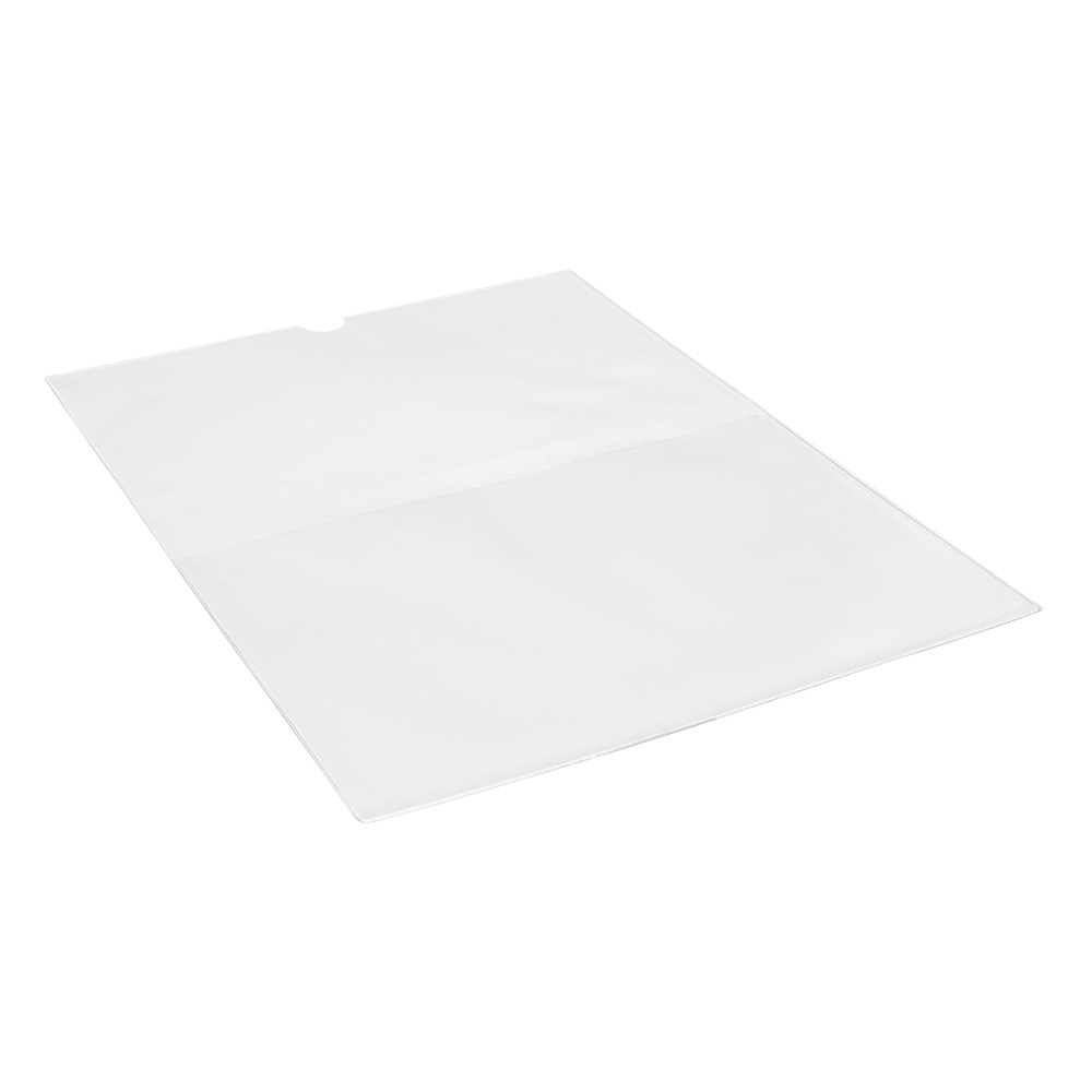 En broschyrpåse i kraftig plast med utvändig påsvetsad ficka för informationsblad, broschyr, kort eller etikett.