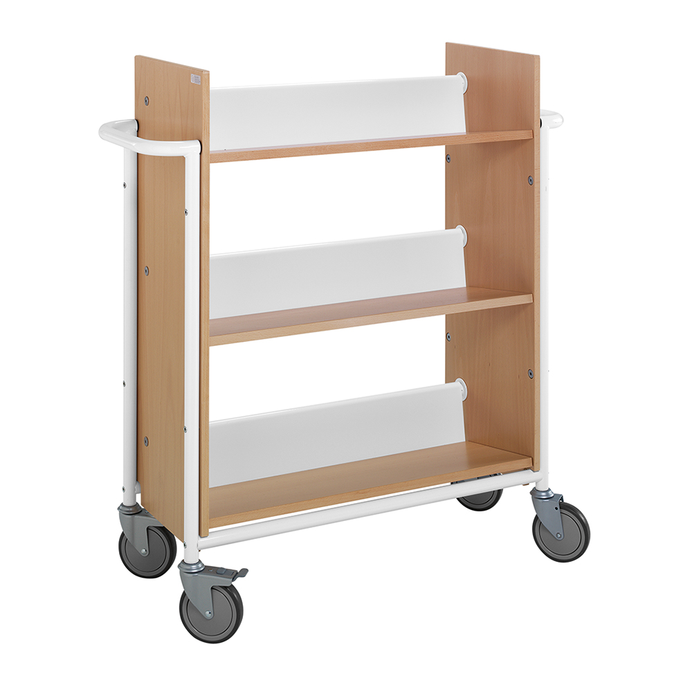 Enkelsidig vagn med 3 fasta bakåtlutande hyllplan som säkerställer effektiv förvaring.
