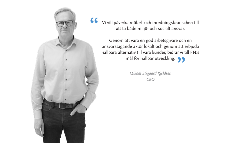 Vi bidrar till FN:s mål för hållbar utveckling genom att påverka möbel- och inredningsbranschen att ta miljömässigt och socialt ansvar, genom att vara en bra arbetsgivare, en ansvarstagande regional aktör och genom att hjälpa våra kunder att bli mer hållbara.