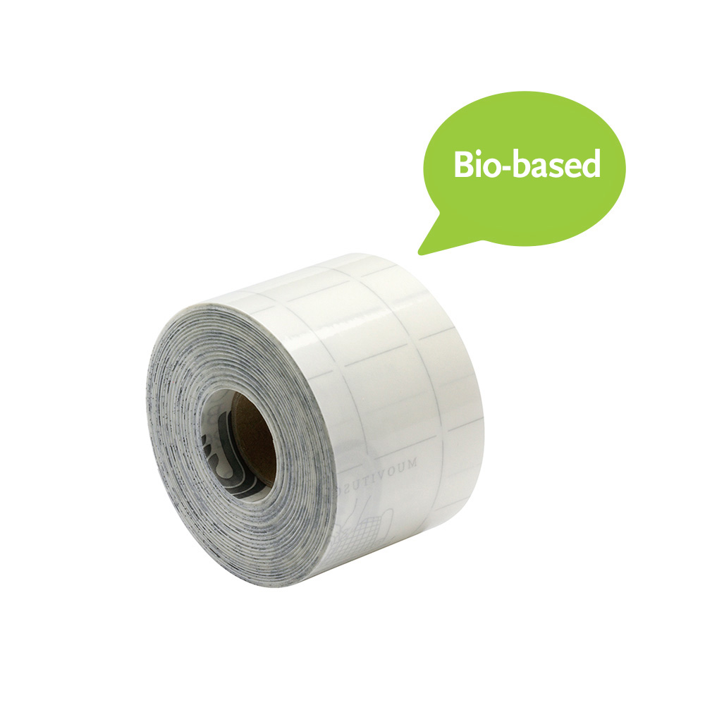 Den självhäftande, blanka tejp är tillverkad av plast med 75% biologisk råvara (sockerrör) och vattenbaserat akryllim.