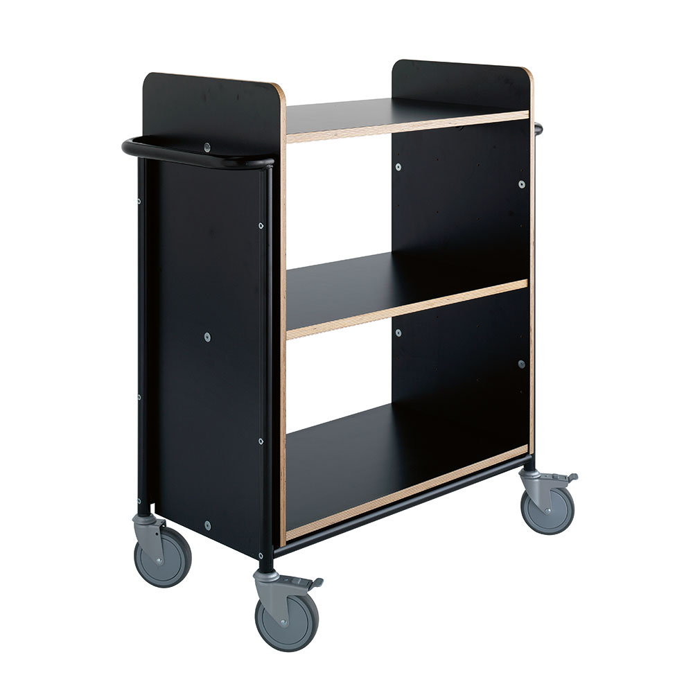 Rymlig bokvagn/transportvagn med generöst utrymme mellan hyllplan. Lämplig för alla bokstorlekar och pärmar.